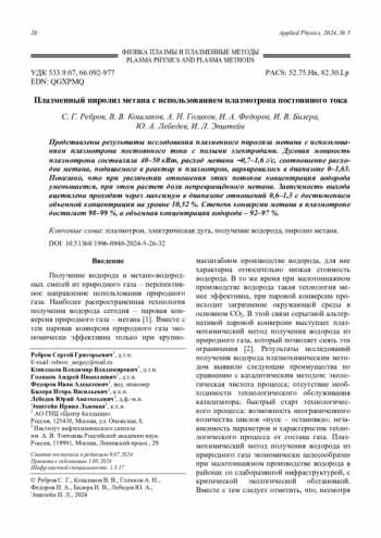 Плазменный пиролиз метана с использованием плазмотрона постоянного тока