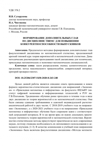 Целью данной работы является описание опыта преподавания в новом формате вероятностно-статистических дисциплин для направлений «Экономика» и «Прикладная математика и информатика» на факультете ИЦЭиИТ (институт цифровой экономики и информационных технологий) в РЭУ им. Г.В.Плеханова.