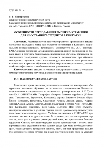 НИКИФОРОВА С. В. ОСОБЕННОСТИ ПРЕПОДАВАНИЯ ВЫСШЕЙ МАТЕМАТИКИ ДЛЯ ИНОСТРАННЫХ СТУДЕНТОВ В КНИТУ-КАИ // АКТУАЛЬНЫЕ ПРОБЛЕМЫ ПРЕПОДАВАНИЯ МАТЕМАТИКИ В ТЕХНИЧЕСКОМ ВУЗЕ. 2019. № 7