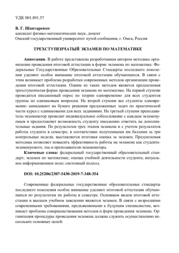 В работе представлена разработанная автором методика организации проведения итоговой аттестации в форме экзамена по математике. Федеральные Государственные Образовательные Стандарты последнего поколения уделяют особое внимание итоговой аттестации обучающихся. В связи с этим возникает проблема разработки современных методов организации проведения итоговой аттестации. Одним из таких методов является предлагаемая трехступенчатая форма проведения экзамена по математике. На первой ступени проводится письменный опрос по теории одновременно для всех студентов группы по одинаковым вопросам. На второй ступени все студенты одновременно записывают на бумаге решения предложенных задач по практической части курса с одинаковыми для всех заданиями. На третьей ступени преподаватель-экзаменатор проводит индивидуальное собеседование с каждым экзаменуемым и предоставляет возможность студенту письменно ответить на дополнительные задания. По результатам трех этапов экзамена и с учетом результатов работы студента в семестре, в соответствии полученными им баллами за три контрольные недели, выставляется итоговая оценка за экзамен. Предлагаемая методика позволяет повысить эффективность работы на экзамене как студента-экзаменуемого, так и преподавателя-экзаменатора.