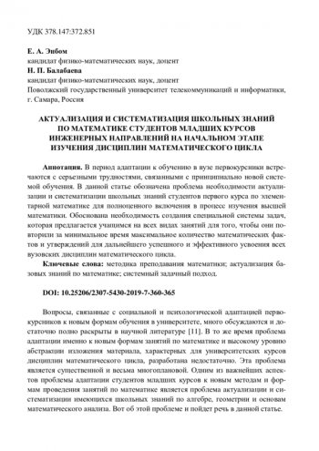 ЭНБОМ Е. А., БАЛАБАЕВА Н. П. АКТУАЛИЗАЦИЯ И СИСТЕМАТИЗАЦИЯ ШКОЛЬНЫХ ЗНАНИЙ ПО МАТЕМАТИКЕ СТУДЕНТОВ МЛАДШИХ КУРСОВ ИНЖЕНЕРНЫХ НАПРАВЛЕНИЙ НА НАЧАЛЬНОМ ЭТАПЕ ИЗУЧЕНИЯ ДИСЦИПЛИН МАТЕМАТИЧЕСКОГО ЦИКЛА // АКТУАЛЬНЫЕ ПРОБЛЕМЫ ПРЕПОДАВАНИЯ МАТЕМАТИКИ В ТЕХНИЧЕСКОМ ВУЗЕ. 2019. № 7