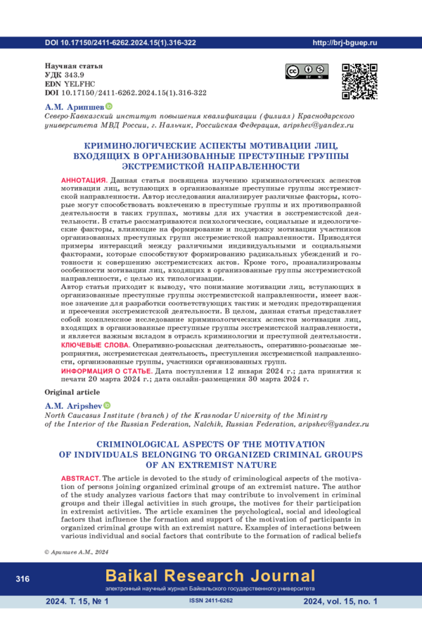 Данная статья посвящена изучению криминологических аспектов мотивации лиц, вступающих в организованные преступные группы экстремистской направленности. Автор исследования анализирует различные факторы, которые могут способствовать вовлечению в преступные группы и их противоправной деятельности в таких группах, мотивы для их участия в экстремистской деятельности. В статье рассматриваются психологические, социальные и идеологические факторы, влияющие на формирование и поддержку мотивации участников организованных преступных групп экстремистской направленности. Приводятся примеры интеракций между различными индивидуальными и социальными факторами, которые способствуют формированию радикальных убеждений и готовности к совершению экстремистских актов. Кроме того, проанализированы особенности мотивации лиц, входящих в организованные группы экстремистской направленности, с целью их типологизации. Автор статьи приходит к выводу, что понимание мотивации лиц, вступающих в организованные преступные группы экстремистской направленности, имеет важное значение для разработки соответствующих тактик и методик предотвращения и пресечения экстремистской деятельности. В целом, данная статья представляет собой комплексное исследование криминологических аспектов мотивации лиц, входящих в организованные преступные группы экстремистской направленности, и является важным вкладом в отрасль криминологии и преступной деятельности.