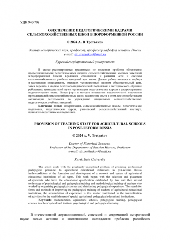 В статье рассматривается практически не изученная проблема обеспечения профессиональными педагогическими кадрами сельскохозяйственных учебных заведений в пореформенной России в условиях становления и развития сети и системы сельскохозяйственных учебных заведений всех типов. Данная работа началась с подбора и расстановки специалистов, имеющих установленный законом образовательный ценз, затем перешла в стадию психолого-педагогической подготовки и методического обучения работавших преподавателей путем организации педагогических курсов и распространения педагогического опыта. Поиск форм и методов повышения педагогической подготовки преподавателей сельскохозяйственных школ, накопление опыта в этом деле способствовали активизации деятельности по учреждению специальных сельскохозяйственных педагогических учебных заведений.