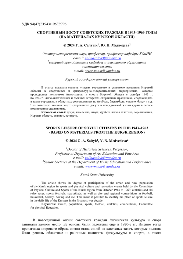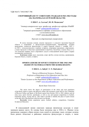 В статье показана степень участия городского и сельского населения Курской области в спортивных и физкультурно-оздоровительных мероприятиях, которые проводились комитетом физкультуры и спорта Курской области с октября 1943 г. по 1963 г.: легкоатлетических и лыжных эстафетах, спортивных праздниках, спартакиадах, а также городских и областных соревнованиях по футболу, баскетболу, хоккею, боксу и т.д. Это позволило выявить место спортивного досуга в повседневной жизни курян в первое послевоенное десятилетие.