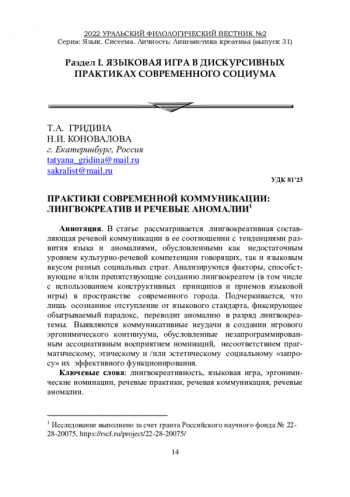 В статье рассматривается лингвокреативная составляющая речевой коммуникации в ее соотношении с тенденциями развития языка и аномалиями, обусловленными как недостаточным уровнем культурно-речевой компетенции говорящих, так и языковым вкусом разных социальных страт. Анализируются факторы, способствующие и/или препятствующие созданию лингвокреатем (в том числе с использованием конструктивных принципов и приемов языковой игры) в пространстве современного города. Подчеркивается, что лишь осознанное отступление от языкового стандарта, фиксирующее обыгрываемый парадокс, переводит аномалию в разряд лингвокреатемы. Выявляются коммуникативные неудачи в создании игрового эргонимического континуума, обусловленные незапрограммированным ассоциативным восприятием номинаций, несоответствием прагматическому, этическому и /или эстетическому социальному «запросу» их эффективного функционирования.