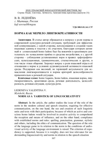 В статье автор обращается к вопросу о роли нормы в современной культурно-речевой ситуации, требующей для эффективной коммуникации, с одной стороны, использования и создания таких языковых единиц и текстов с их участием, благодаря которым активный и сознательный homo ludens был бы вовлечён в креативную деятельность по осмыслению приёма и средства воздействия, а с другой стороны - соблюдения установленных норм и правил: орфографических, пунктуационных, грамматических, стилистических и других, в том числе этики общения. Затронут вопрос о роли языковой игры в её отношении к норме в условиях аудиовизуальной активности языковой среды. Поддержан как весомый, не теряющий актуальности для осмысления лингвокреативности и нормы критерий целесообразности применительно к речевой ситуации.