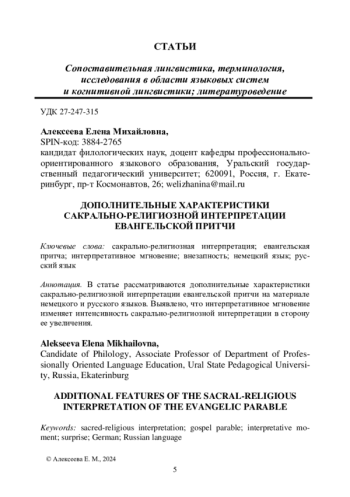 В статье рассматриваются дополнительные характеристики сакрально-религиозной интерпретации евангельской притчи на материале немецкого и русского языков. Выявлено, что интерпретативное мгновение изменяет интенсивность сакрально-религиозной интерпретации в сторону ее увеличения.