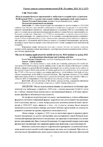 Львова Т. Г. Использование беговых приложений для мобильных устройств студентами Московского авиационного института (национального исследовательского университета) в 2022-2023 учебном году. 10.34835/issn.2308-1961.2023.09. p262-266 // Ученые записки университета им. П.Ф. Лесгафта. 2023. № 9 (223). С. 262-265. DOI: 10.34835/issn.2308-1961.2023.09.p262-266 EDN: AFNOTV
