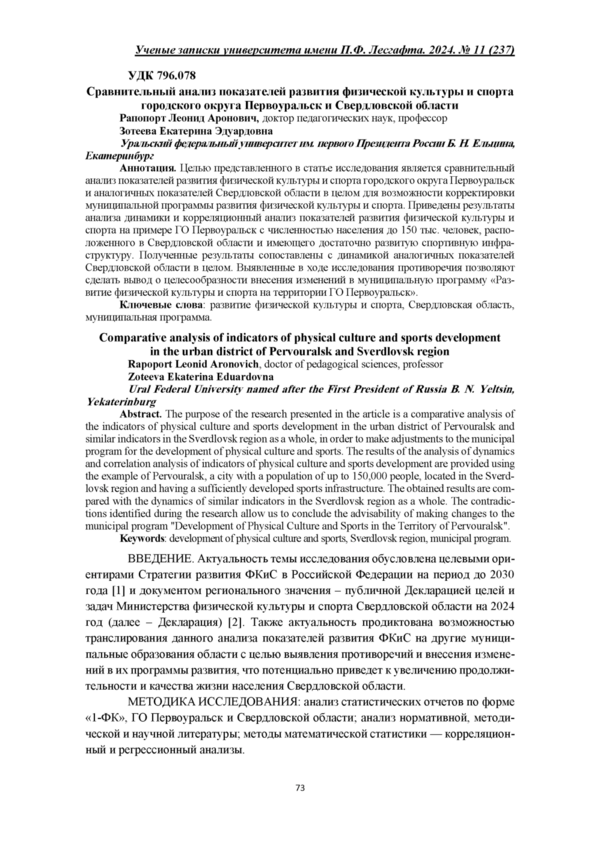 Приведены результаты анализа динамики и корреляционный анализ показателей развития физической культуры и спорта на примере ГО Первоуральск с численностью населения до 150 тыс. человек, расположенного в Свердловской области и имеющего достаточно развитую спортивную инфраструктуру.