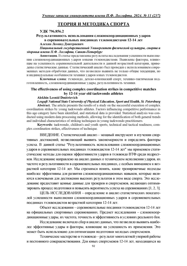 Статистический анализ был проведен с использованием современных методов обработки данных, что позволило выявить не только общие тенденции, но и индивидуальные особенности техники ударов юных тхэквондистов.