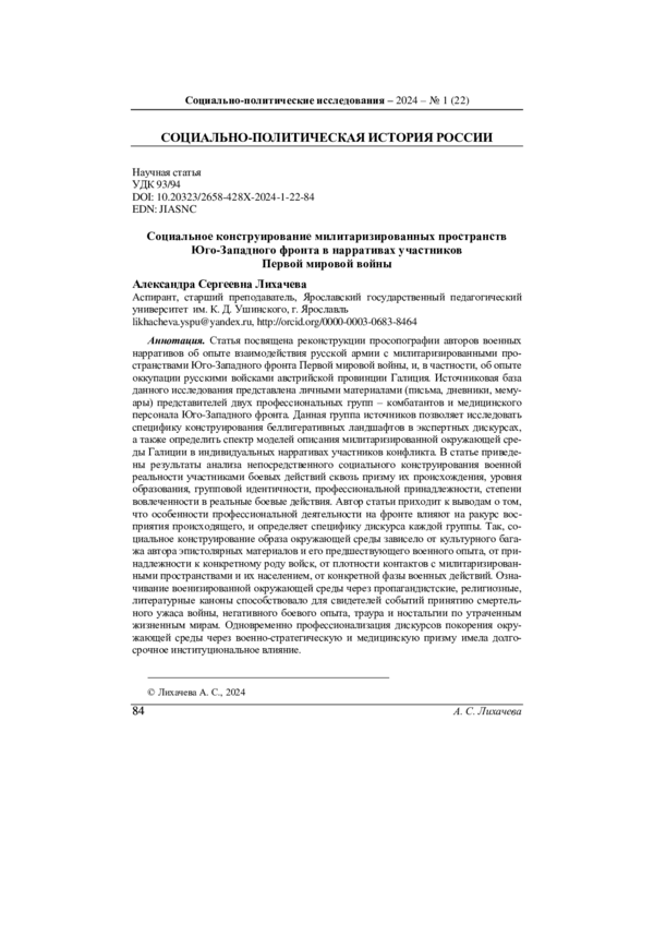 Статья посвящена реконструкции просопографии авторов военных нарративов об опыте взаимодействия русской армии с милитаризированными пространствами Юго-Западного фронта Первой мировой войны, и, в частности, об опыте оккупации русскими войсками австрийской провинции Галиция. Источниковая база данного исследования представлена личными материалами (письма, дневники, мемуары) представителей двух профессиональных групп - комбатантов и медицинского персонала Юго-Западного фронта. Данная группа источников позволяет исследовать специфику конструирования беллигеративных ландшафтов в экспертных дискурсах, а также определить спектр моделей описания милитаризированной окружающей среды Галиции в индивидуальных нарративах участников конфликта. В статье приведены результаты анализа непосредственного социального конструирования военной реальности участниками боевых действий сквозь призму их происхождения, уровня образования, групповой идентичности, профессиональной принадлежности, степени вовлеченности в реальные боевые действия. Автор статьи приходит к выводам о том, что особенности профессиональной деятельности на фронте влияют на ракурс восприятия происходящего, и определяет специфику дискурса каждой группы. Так, социальное конструирование образа окружающей среды зависело от культурного багажа автора эпистолярных материалов и его предшествующего военного опыта, от принадлежности к конкретному роду войск, от плотности контактов с милитаризированными пространствами и их населением, от конкретной фазы военных действий. Означивание военизированной окружающей среды через пропагандистские, религиозные, литературные каноны способствовало для свидетелей событий принятию смертельного ужаса войны, негативного боевого опыта, траура и ностальгии по утраченным жизненным мирам. Одновременно профессионализация дискурсов покорения окружающей среды через военно-стратегическую и медицинскую призму имела долгосрочное институциональное влияние.