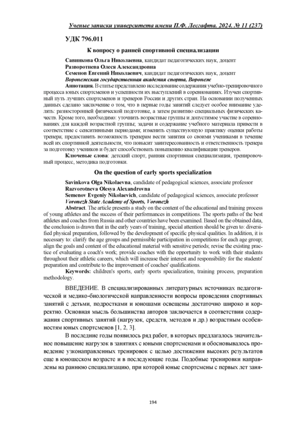 Хвацкая Е. Е., Латышева Н. Е. Проблема ранней спортивной специализации (профессионализации) // Вестник Псковского государственного университета. Серия: психолого-педагогические науки. 2015. № 1. С. 194-201. EDN: TLICKX
