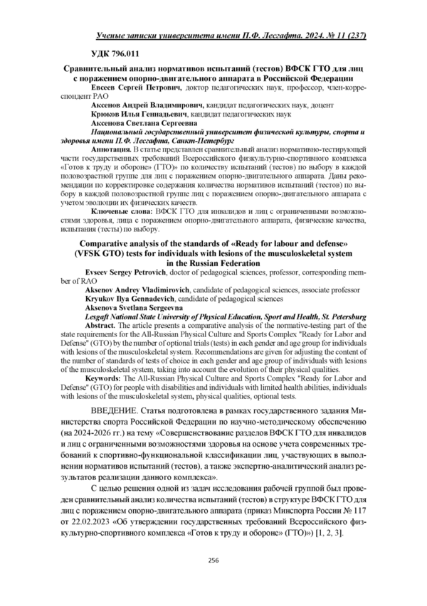 Статья подготовлена в рамках государственного задания Министерства спорта Российской Федерации по научно-методическому обеспечению (на 2024-2026 гг.) на тему «Совершенствование разделов ВФСК ГТО для инвалидов и лиц с ограниченными возможностями здоровья на основе учета современных требований к спортивно-функциональной классификации лиц, участвующих в выполнении нормативов испытаний (тестов), а также экспертно-аналитический анализ результатов реализации данного комплекса».