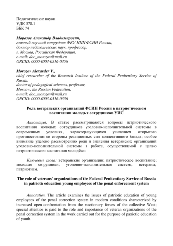 - Морозов А. В. Значение ветеранских организаций территориальных органов и образовательных организаций ФСИН России в патриотическом воспитании сотрудников уголовно-исполнительной системы и членов их семей // В сборнике: Петербургские пенитенциарные конференции // Сборник материалов комплекса международных научно-практических конференций / Под общ. ред. О. И. Нестерова. СПб.: СПбУФСИН, 2023. С. 23-29.