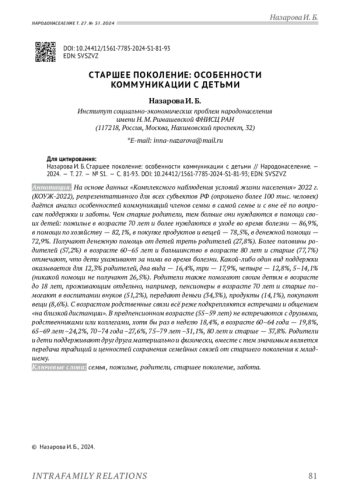 На основе данных «Комплексного наблюдения условий жизни населения» 2022 г. (КОУЖ-2022), репрезентативного для всех субъектов РФ (опрошено более 100 тыс. человек) даётся анализ особенностей коммуникаций членов семьи в самой семье и с вне её по вопросам поддержки и заботы. Чем старше родители, тем больше они нуждаются в помощи своих детей: пожилые в возрасте 70 лет и более нуждаются в уходе во время болезни - 86,9%, в помощи по хозяйству - 82,1%, в покупке продуктов и вещей - 78,5%, в денежной помощи - 72,9%. Получают денежную помощь от детей треть родителей (27,8%). Более половины родителей (57,2%) в возрасте 60-65 лет и большинство в возрасте 80 лет и старше (77,7%) отмечают, что дети ухаживают за ними во время болезни. Какой-либо один вид поддержки оказывается для 12,3% родителей, два вида - 16,4%, три - 17,9%, четыре - 12,8%, 5-14,1% (никакой помощи не получают 26,5%). Родители также помогают своим детям в возрасте до 18 лет, проживающим отдельно, например, пенсионеры в возрасте 70 лет и старше помогают в воспитании внуков (51,2%), передают деньги (34,3%), продукты (14,1%), покупают вещи (8,6%). С возрастом родственные связи всё реже подкрепляются встречами и общением «на близкой дистанции». В предпенсионном возрасте (55-59 лет) не встречаются с друзьями, родственниками или коллегами, хотя бы раз в неделю 18,4%, в возрасте 60-64 года - 19,8%, 65-69 лет -24,2%, 70-74 года -27,6%, 75-79 лет -31,1%, 80 лет и старше - 37,8%. Родители и дети поддерживают друг друга материально и физически, вместе с тем значимым является передача традиций и ценностей сохранения семейных связей от старшего поколения к младшему.