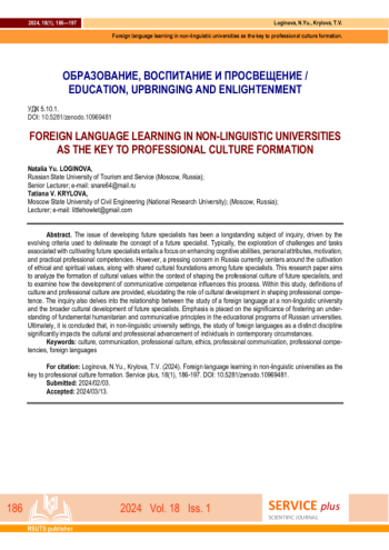 1\. Batyshev\, S\.Ya\. \(1997\)\. Professionalnaya pedagogika \[Professional Pedagogy\]\. Moscow: Professional Education\. \(In Russ\.\)\. ▼ Контекст 2\. Borodavkin\, S\.V\. \(2004\)\. Gumanizm v kulture i kultura v gumanizme \[Humanism in culture and culture in humanism\]\. Moscow: Voprosy philosophii\. \(In Russ\.\)\. ▼ Контекст 3\. Flier\, A\.Ya\. \(1999\)\. Kultura kak smysl istorii: Obshchestvennye nauki i sovremennost \[Culture as the Meaning of History: Social Sciences and Modernity\]\. Moscow: Culture\. \(In Russ\.\)\. ▼ Контекст 4\. Kagan\, M\.S\. \(1993\)\. Obshchaya harakteristika kultury\, ee stroeniya i funkcij \[General characteristics of culture\, its structure and functions\]\. In: Vvedenie v teoriyu hudozhestvennoj kultury \[Introduction to the theory of artistic culture\]\. St\. Petersburg: St\. Petersburg University\. \(In Russ\.\)\. ▼ Контекст 5\. Karhanova\, S\.A\. \(2007\)\. Faktory professionalnoj uspeshnosti specialista \[Factors of professional success of a specialist\]\. SGU\. \(In Russ\.\)\. ▼ Контекст 6\. Kurguzov\, V\.L\. \(2000\)\. Gumanitarnaya kultura: teoreticheskoe obosnovanie fenomena i problemy funkcionirovaniya v tekhnicheskom vuze\. \[Humanitarian culture: theoretical substantiation of the phenomenon and problems of functioning in a technical university\]\. Ulan\-Ude: VSGTU Publishing House\. \(In Russ\.\)\. ▼ Контекст 7\. Likhachev\, D\.S\. \(2000\)\. Russkaya kultura \[Russian culture\]\. Moscow: Art\. \(In Russ\.\)\. ▼ Контекст 8\. Persikova\, T\.N\. \(2002\)\. Mezhkulturnaya kommunikaciya i korporativnaya kultura \[Intercultural Communication and Corporate Culture\]\. Moscow: Logos\. \(In Russ\.\)\. EDN: ZRGPNN 9\. Rybak\, M\.V\.\, \(2021\)\. English teaching theory and methodology for the higher education\. Service plus\, 15\(4\)\, 55\-65\. DOI: 10\.24412/2413\-693X\-2021\-4\-55\-65 EDN: ELXSEP ▼ Контекст 10\. Rybak\, M\.V\.\, Grigoryan\, M\.I\. \(2023\)\. The impact of the ICT usage in a foreign language learning on cultural assimbilative processes of the country\. Service plus\, 17\(2\)\, 162\-170\. DOI: 10\.5281/zenodo\.8238050 EDN: GXKZLH 11\. Sadokhin\, A\.P\. \(2005\)\. Vvedenie v teoriyu mezhkulturnoj kommunikacii \[Introduction to the Theory of Intercultural Communication\]\. Moscow: Higher School\. \(In Russ\.\)\. 12\. Schweitzer\, A\.D\.\, Nikolsky\, L\.B\. \(1978\)\. Vvedenie v sociolingvistiku: uchebnoe posobie\. \[Introduction to Sociolinguistics: textbook\]\. Moscow: Nauka\. \(In Russ\.\)\. ▼ Контекст 13\. Silyaeva\, E\.G\. \(1994\)\. Moralnye cennosti i lichnost \[Moral values and personality\]\. Moscow: MGU\. \(In Russ\.\)\. 14\. Vyzhletsov\, G\.P\. \(1996\)\. Aksiologiya kultury \[Axiology of Culture\]\. St\. Petersburg: St\. Petersburg University\. \(In Russ\.\)\. ▼ Контекст 15\. Weisgerber\, I\. L\. \(1993\)\. Rodnoj yazyk i formirovanie duha \[Native language and the formation of the spirit\]\. Moscow: Moscow University\. \(In Russ\.\)\. ▼ Контекст 16\. Zapesotsky\, A\.S\. \(1996\)\. Gumanitarnaya kultura i gumanitarnoe obrazovanie \[Humanitarian culture and humanitarian education\]\. St\. Petersburg: IGUP\. \(In Russ\.\)\.