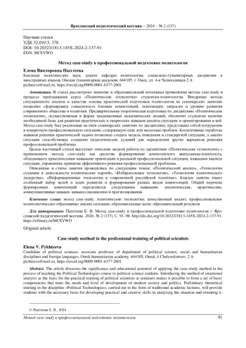 В статье рассмотрено значение и образовательный потенциал применения метода case-study в процессе преподавания курса «Политические технологии» студентам-политологам. Внедрение метода ситуационного анализа в качестве основы практической подготовки политологов на семинарских занятиях позволяет сформировать совокупность базовых компетенций, отвечающих запросам и уровню развития современного общества и политики. Предварительная теоретическая подготовка по дисциплине «Политические технологии», осуществляемая в форме традиционных академических лекций, обеспечит студентам наличие необходимой базы для развития практических и творческих навыков анализа ситуации и ориентирования в ней. Метод case-study был реализован на пяти семинарских занятиях по дисциплине, представлял собой погружение в конкретную профессиональную ситуацию, содержащую одну или несколько проблем. Коллективная отработка навыков решения практической задачи позволила создать модель поведения в стандартной ситуации, а анализ ситуации способствовал созданию педагогических условий для определения других вариантов решения профессиональной проблемы. Целью настоящей статьи выступает описание модели работы по дисциплине «Политические технологии» с применением метода case-study как средства формирования компетентного выпускника-политолога, обладающего практическими навыками ориентации в реальной профессиональной ситуации, навыками анализа ситуации, управления, принятия эффективного решения профессиональной проблемы. Описанные в статье занятия проводились по следующим темам: «Политический анализ», «Технологии создания и деятельности политических партий», «Избирательные технологии», «Технологии политического лидерства», «Информационные технологии в современной российской политике». Каждое занятие имеет особенный набор целей и задач развития и формирования разных видов компетенций. Общий перечень формируемых компетенций определяется следующими навыками: аналитические, практические, коммуникативные навыки, навыки самоанализа и прогнозирования.