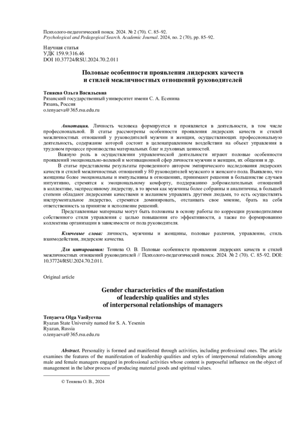 Личность человека формируется и проявляется в деятельности, в том числе профессиональной. В статье рассмотрены особенности проявления лидерских качеств и стилей межличностных отношений у руководителей мужчин и женщин, осуществляющих профессиональную деятельность, содержание которой состоит в целенаправленном воздействии на объект управления в трудовом процессе производства материальных благ и духовных ценностей. Важную роль в осуществлении управленческой деятельности играют половые особенности проявлений эмоционально-волевой и мотивационной сфер личности мужчин и женщин, их общения и др. В статье представлены результаты проведенного автором эмпирического исследования лидерских качеств и стилей межличностных отношений у 80 руководителей мужского и женского пола. Выявлено, что женщины более эмоциональны и импульсивны в отношениях, принимают решения в большинстве случаев интуитивно, стремятся к эмоциональному комфорту, поддержанию доброжелательных отношений в коллективе, экспрессивному лидерству, в то время как мужчины более собранны и аналитичны, в большей степени обладают лидерскими качествами и желанием управлять другими людьми, то есть осуществлять инструментальное лидерство, стремятся доминировать, отстаивать свое мнение, брать на себя ответственность за принятие и исполнение решений. Представленные материалы могут быть положены в основу работы по коррекции руководителями собственного стиля управления с целью повышения его эффективности, а также по формированию коллектива организации в зависимости от пола руководителя.