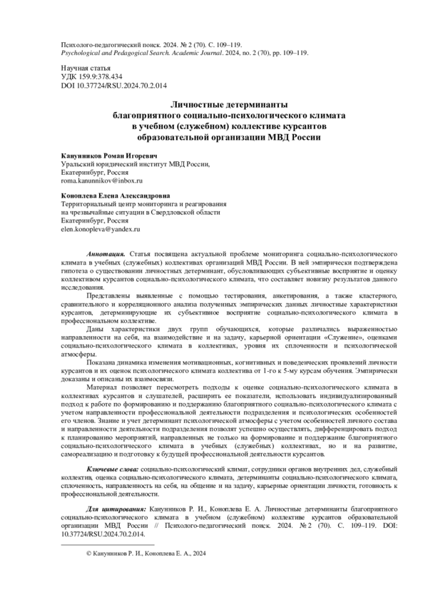 Статья посвящена актуальной проблеме мониторинга социально-психологического климата в учебных (служебных) коллективах организаций МВД России. В ней эмпирически подтверждена гипотеза о существовании личностных детерминант, обусловливающих субъективные восприятие и оценку коллективом курсантов социально-психологического климата, что составляет новизну результатов данного исследования. Представлены выявленные с помощью тестирования, анкетирования, а также кластерного, сравнительного и корреляционного анализа полученных эмпирических данных личностные характеристики курсантов, детерминирующие их субъективное восприятие социально-психологического климата в профессиональном коллективе. Даны характеристики двух групп обучающихся, которые различались выраженностью направленности на себя, на взаимодействие и на задачу, карьерной ориентации «Служение», оценками социально-психологического климата в коллективах, уровня их сплоченности и психологической атмосферы. Показана динамика изменения мотивационных, когнитивных и поведенческих проявлений личности курсантов и их оценок психологического климата коллектива от 1-го к 5-му курсам обучения. Эмпирически доказаны и описаны их взаимосвязи. Материал позволяет пересмотреть подходы к оценке социально-психологического климата в коллективах курсантов и слушателей, расширить ее показатели, использовать индивидуализированный подход к работе по формированию и поддержанию благоприятного социально-психологического климата с учетом направленности профессиональной деятельности подразделения и психологических особенностей его членов. Знание и учет детерминант психологической атмосферы с учетом особенностей личного состава и направленности деятельности подразделения позволят успешно осуществлять, дифференцировать подход к планированию мероприятий, направленных не только на формирование и поддержание благоприятного социально-психологического климата в учебных (служебных) коллективах, но и на развитие, самореализацию и подготовку к будущей профессиональной деятельности курсантов.