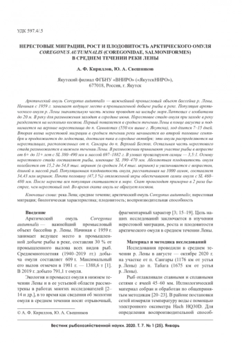 Арктический омуль Coregonus autumnalis - важнейший промысловый объект бассейна р. Лены. Начиная с 1959 г. занимает ведущее место в промышленной добыче рыбы в реке. Популяция арктического омуля р. Лены значительную часть жизни проводит на шельфе моря Лаптевых с изобатами до 20 м. В реку для размножения заходит в середине июня. Нерестовое стадо омуля при заходе в реку разделяется на несколько косяков. Первый появляется в среднем течении Лены в конце августа и поднимается на верхние нерестилища до п. Санняхтах (550 км выше г. Якутска), ход длится 7-15 дней. Вторая волна нерестовой миграции в среднем течении реки начинается во второй половине сентября и продолжается до ледостава, достигая пика в середине октября; эти омули распределяются на нерестилищах, расположенных от п. Сангары до п. Верхний Бестях. Остальная часть нерестового стада размножается в нижнем течении Лены. В размножении принимают участие рыбы в возрасте от 6+ до 11+ лет с SL 380-490 мм и массой 697-1882 г. В уловах превалируют самцы - 3,5:1. Основу нерестового стада составляют рыбы, имеющие SL 390-470 мм. Абсолютная плодовитость омуля колеблется от 15,2 до 54,8 тыс. икринок (в среднем 34,4 тыс. икринок) и увеличивается с возрастом, длиной и массой рыб. Популяционная плодовитость омуля, рассчитанная на 1000 самок, составляет 34,43 млн икринок. Почти половину (47,3 %) отложенной икры обеспечивают самки омуля с SL 460480 мм. После нереста вся популяция скатывается в море. Скат происходит примерно в 2 раза быстрее, чем нерестовый ход. Во время ската омуль не образует косяков.