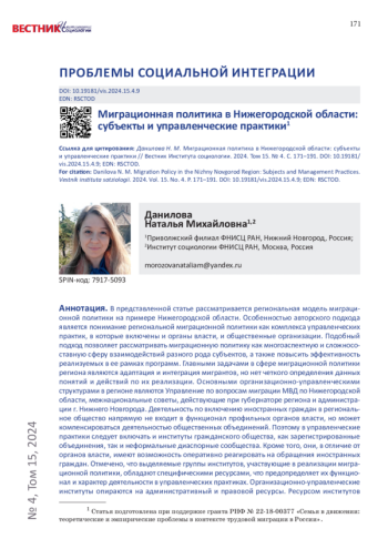 ДАНИЛОВА Н. М. МИГРАЦИОННАЯ ПОЛИТИКА В НИЖЕГОРОДСКОЙ ОБЛАСТИ: СУБЪЕКТЫ И УПРАВЛЕНЧЕСКИЕ ПРАКТИКИ // ВЕСТНИК ИНСТИТУТА СОЦИОЛОГИИ. 2024. ТОМ 15 № 4
