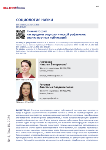 41. Степанов Б. “Comingsoon?”: социология кино и культурный поворот // Социологическое обозрение. 2020. Т. 19. № 4. С. 152-177. ;. DOI: 10.17323/1728-192X-2020-4-152-177 EDN: SKLPQG Stepanov B. “Coming soon?”: Sociology of Cinema and Cultural Turn. Sociologicheskoe obozrenie, 2020: 19: 4: 152-177 (in Russ.). ;. DOI: 10.17323/1728-192X-2020-4-152-177 EDN: SKLPQG