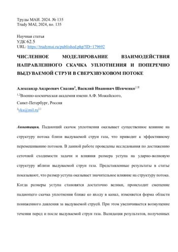 5. Сназин А.А., Шевченко А.В., Панфилов Е.Б., Прилуцкий И.К. Исследование взаимодействия недорасширенной газовой струи, выдуваемой из тела, с высокоскоростным набегающим потоком // Труды МАИ. 2021. № 119. URL: https://trudymai.ru/published.php?ID=159782. DOI: 10.34759/trd-2021-119-05 EDN: GUUXDE