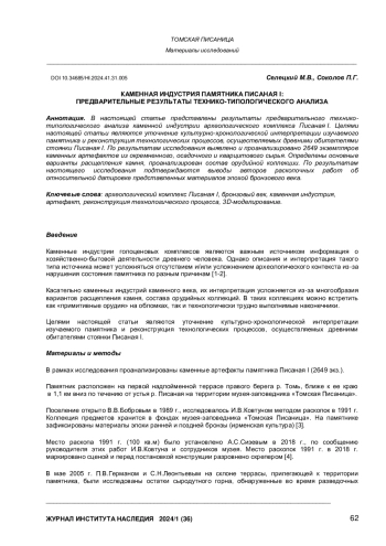Каменные индустрии голоценовых комплексов являются важным источником информация о хозяйственно-бытовой деятельности древнего человека. Однако описания и интерпретация такого типа источника может усложняться отсутствием и/или усложнением археологического контекста из-за нарушения состояния памятника по разным причинам [1-2].