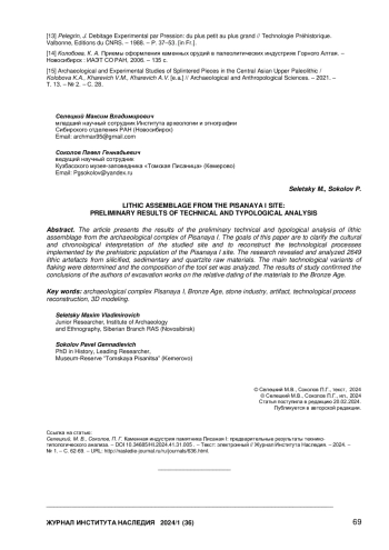 [15] Archaeological and Experimental Studies of Splintered Pieces in the Central Asian Upper Paleolithic / Kolobova K.A., Kharevich V.M., Kharevich A.V. [e.a.] // Archaeological and Anthropological Sciences. – 2021. – Т. 13. – № 2. – С. 28.