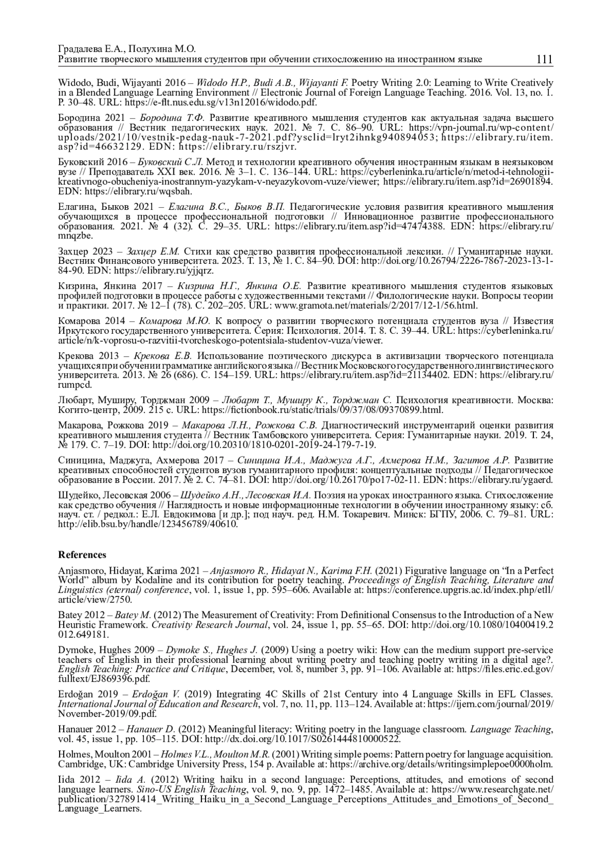 5. Hanauer 2012 - Hanauer D. Meaningful literacy: Writing poetry in the language classroom // Language Teaching. 2012. Vol. 45, issue 1. P. 105-115. DOI: 10.1017/S0261444810000522