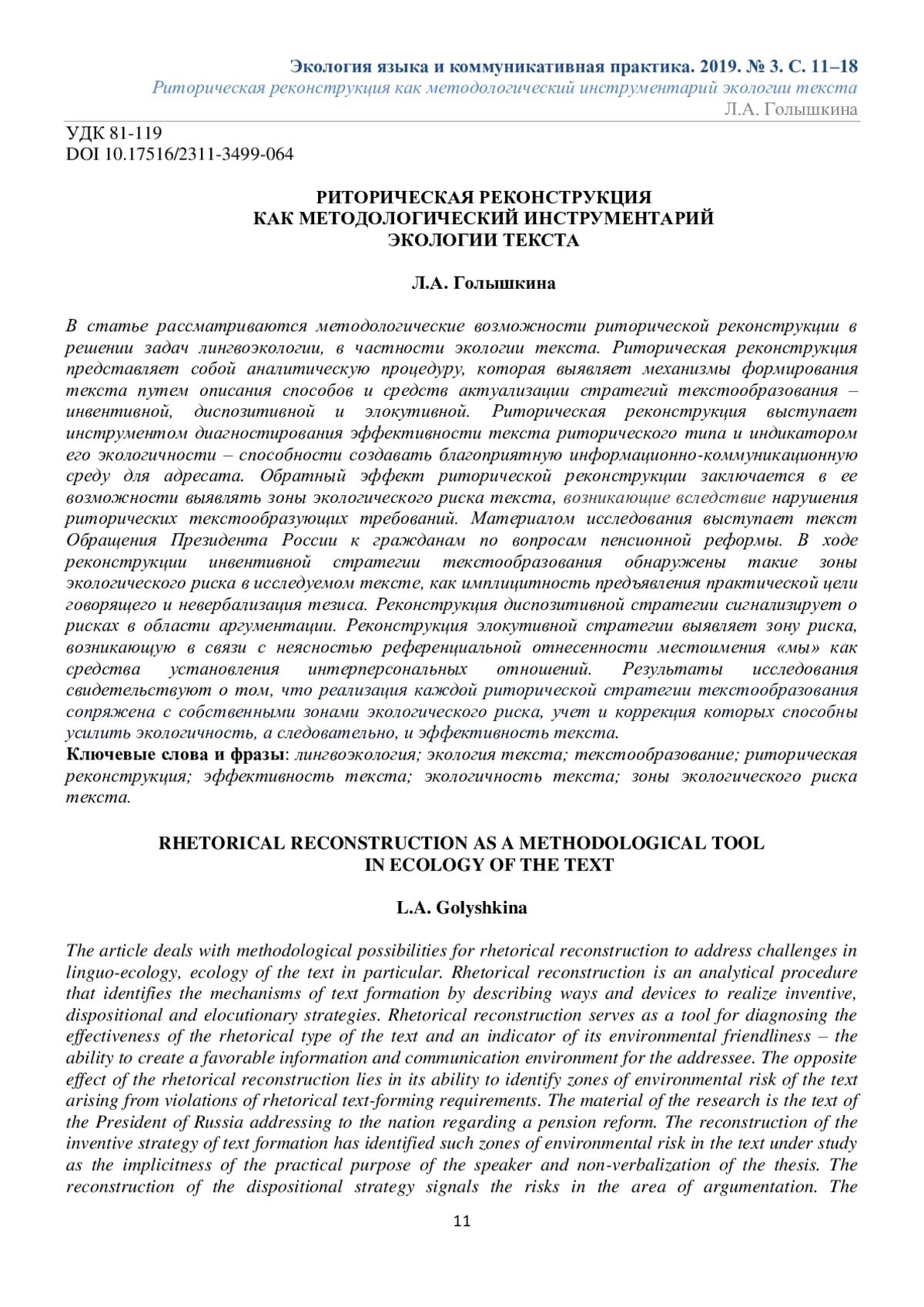 В статье рассматриваются методологические возможности риторической реконструкции в решении задач лингвоэкологии, в частности экологии текста. Риторическая реконструкция представляет собой аналитическую процедуру, которая выявляет механизмы формирования текста путем описания способов и средств актуализации стратегий текстообразования - инвентивной, диспозитивной и элокутивной. Риторическая реконструкция выступает инструментом диагностирования эффективности текста риторического типа и индикатором его экологичности - способности создавать благоприятную информационно-коммуникационную среду для адресата. Обратный эффект риторической реконструкции заключается в ее возможности выявлять зоны экологического риска текста, возникающие вследствие нарушения риторических текстообразующих требований. Материалом исследования выступает текст Обращения Президента России к гражданам по вопросам пенсионной реформы. В ходе реконструкции инвентивной стратегии текстообразования обнаружены такие зоны экологического риска в исследуемом тексте, как имплицитность предъявления практической цели говорящего и невербализация тезиса. Реконструкция диспозитивной стратегии сигнализирует о рисках в области аргументации. Реконструкция элокутивной стратегии выявляет зону риска, возникающую в связи с неясностью референциальной отнесенности местоимения «мы» как средства установления интерперсональных отношений. Результаты исследования свидетельствуют о том, что реализация каждой риторической стратегии текстообразования сопряжена с собственными зонами экологического риска, учет и коррекция которых способны усилить экологичность, а следовательно, и эффективность текста.