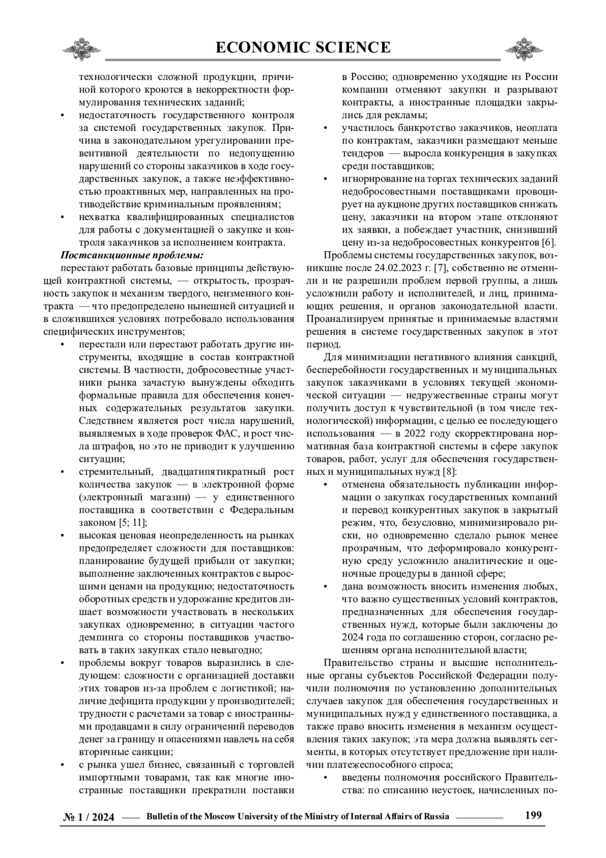 Анализируется вопрос адаптации системы государственных закупок к складывающимся в российском экономико-правовом пространстве реалиям с началом специальной военной операции (СВО). Информационной базой исследования стали аналитические отчеты по рассмотрению сложившихся проблем в рамках осуществления государственных закупок. Предложено разделение выделенных проблем на системные, существующие в разных форматах с момента начала работы российской контрактной системы, и постсанкционные проблемы. Автором рассмотрены используемые законодательной и исполнительной властью меры как инструменты ситуационного реагирования по разрешению проблем, оказывающих влияние на систему государственного заказа. Результаты анализа свидетельствуют о наличии некоторого уменьшения конкурентной борьбы между потенциальными поставщиками товаров (услуг) и увеличении протекционистских мер для отдельных категорий поставщиков. Достижение цели экономического обеспечения национальной безопасности страны потребовало использования инструментов ситуационного реагирования, зачастую идущих вразрез не только с принципами закупочной деятельности, но и с ранее принятыми решениями в области экономической политики.