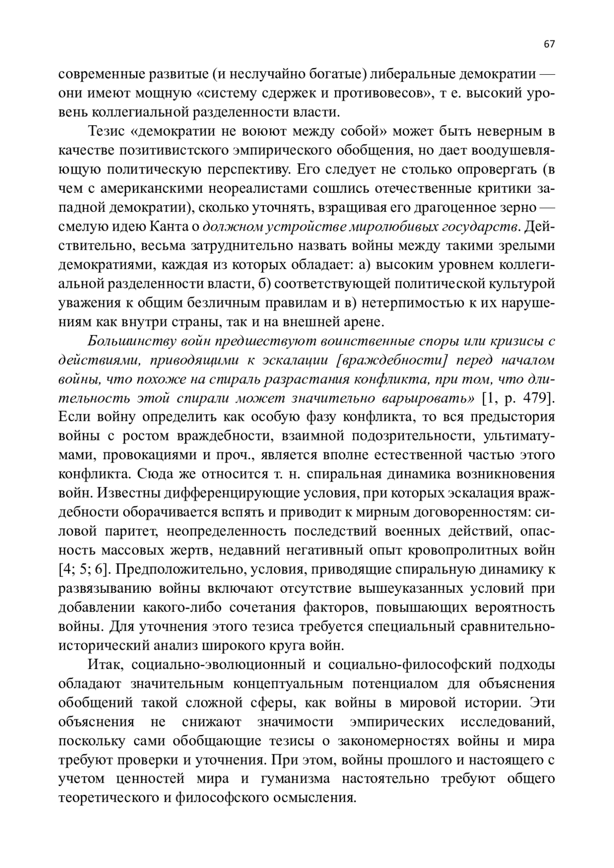 Возникновение и динамика войн не являются строго регулярными, предсказуемыми явлениями, но не являются и полностью случайными. На основе анализа результатов широкого круга исследований военной истории Г. Кэшман сформулировал несколько эмпирических закономерностей, которые требуют теоретического объяснения и социально-философского осмысления. В статье рассматриваются такие вопросы, как войны между сопредельными соседями и стабильными соперниками, территориальные споры, неравенство сил, роль воинственных держав. Особое теоретическое внимание уделено концепции демократического мира, восходящей к идеям И. Канта. Показано, что нормативные и экономические аргументы слабы, тогда как институциональное объяснение более правдоподобно. Система сдержек и противовесов, понимаемая как высокая степень коллегиальной разделенности власти, является важным фактором, препятствующим развязыванию новых войн.