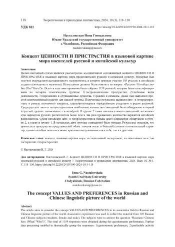 Целью настоящей статьи является рассмотрение ассоциативной составляющей концепта ЦЕННОСТИ И ПРИСТРАСТИЯ в языковой картине мира представителей русской и китайской культур. Материал был получен посредством ассоциативного эксперимента, в котором приняли участие 103 русских и китайских студента (женщины и мужчины). Испытуемые должны были ответить на вопрос: «Русские / Китайцы любят (Что? Кого?)». Всего в ходе анкетирования было собрано 1159 реакций, которые были классифицированы по четырём тематическим группам: 1) гастрономические пристрастия, 2) любимые виды деятельности, 3) персоналии и одушевлённые существа, 4) реалии и символы. Далее был выполнен простой количественный подсчёт для каждой группы. Полученные результаты выявили авто- и гетеростереотипы в рамках изучаемого концепта, характеризующиеся определённым сходством и рядом различий. Среди русских авто- и гетеростереотипов наибольшее количество совпадений было обнаружено в первой и третьей группах, наименьшее - в четвёртой. В группе 2 также оказалось много совпадений, но количество вариантов русских респондентов более чем в два раза превышало количество вариантов китайских респондентов. Среди китайских авто- и гетеростереотипов больше всего совпадений обнаружено в группе 2, а также в группе 1. В остальных двух группах совпадений было меньше. Результаты показали, что ценности и пристрастия представителей обоих этносов носят в большей степени положительный характер, однако китайцы оказались менее критично настроенными как к себе, так и к русским.