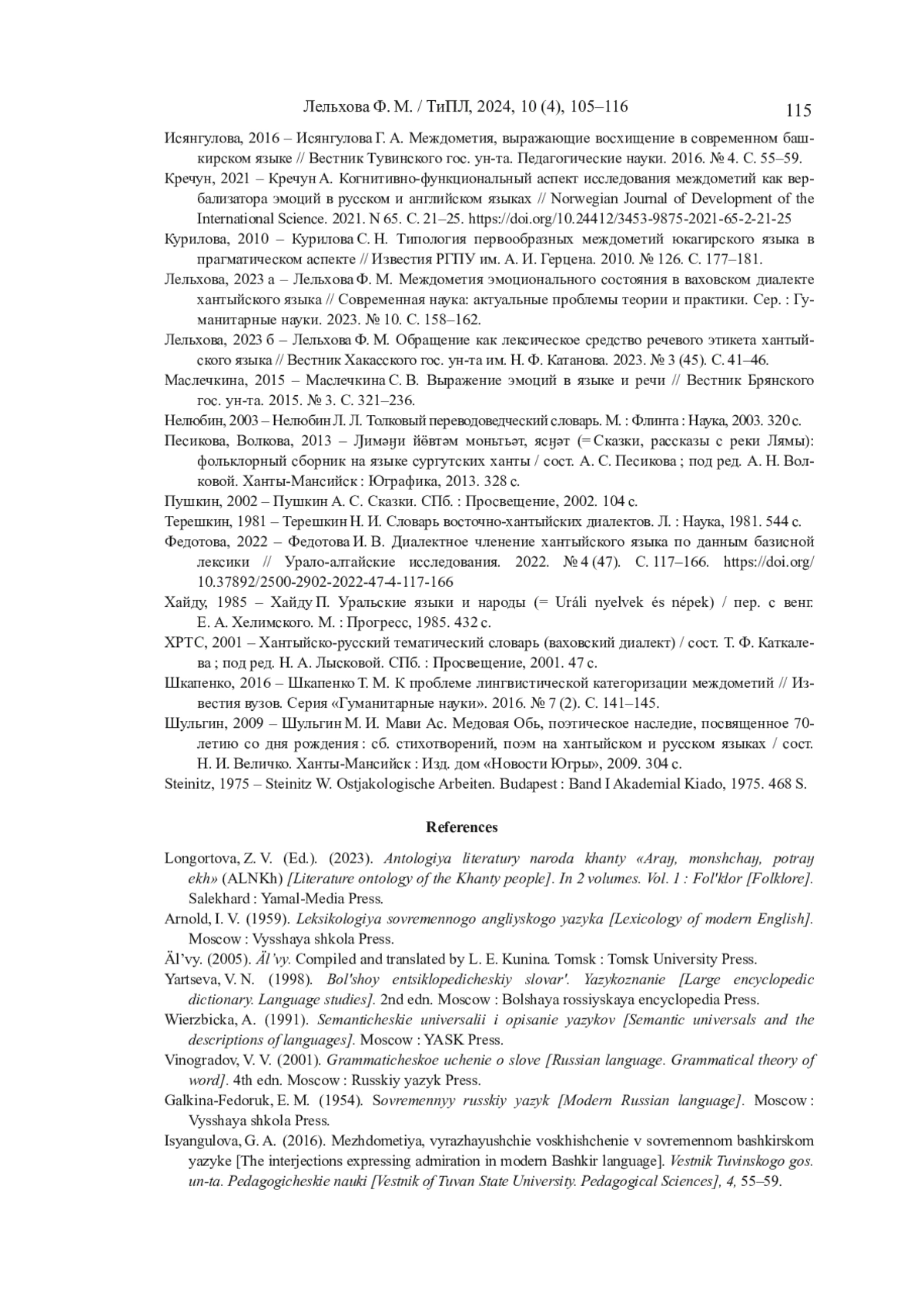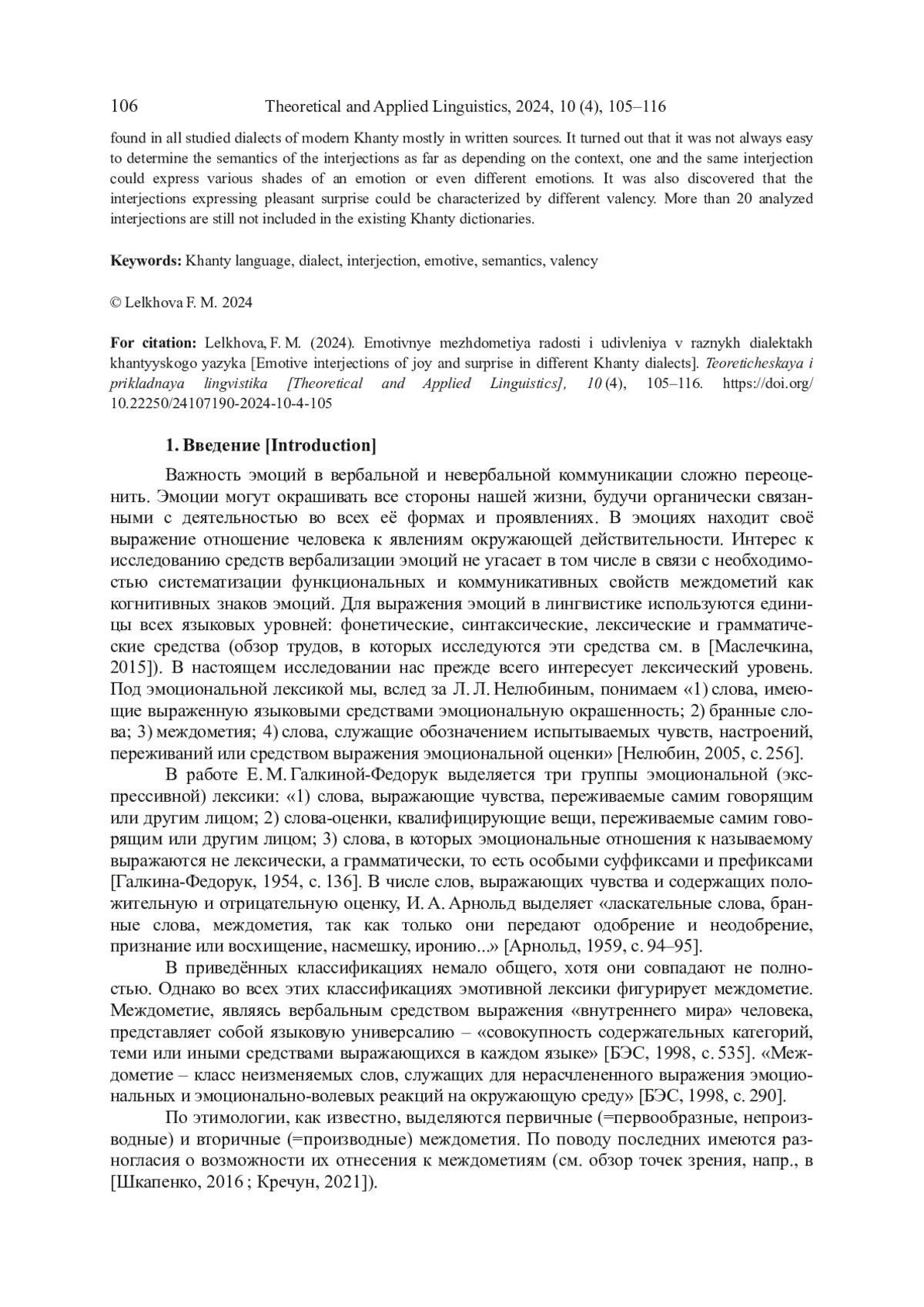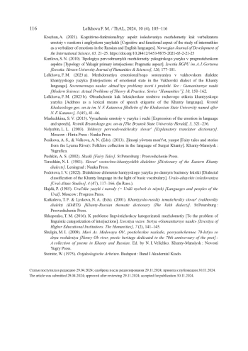 11. Лельхова, 2023 а - Лельхова Ф. М. Междометия эмоционального состояния в ваховском диалекте хантыйского языка // Современная наука: актуальные проблемы теории и практики. Сер.: Гуманитарные науки. 2023. № 10. С. 158-162.