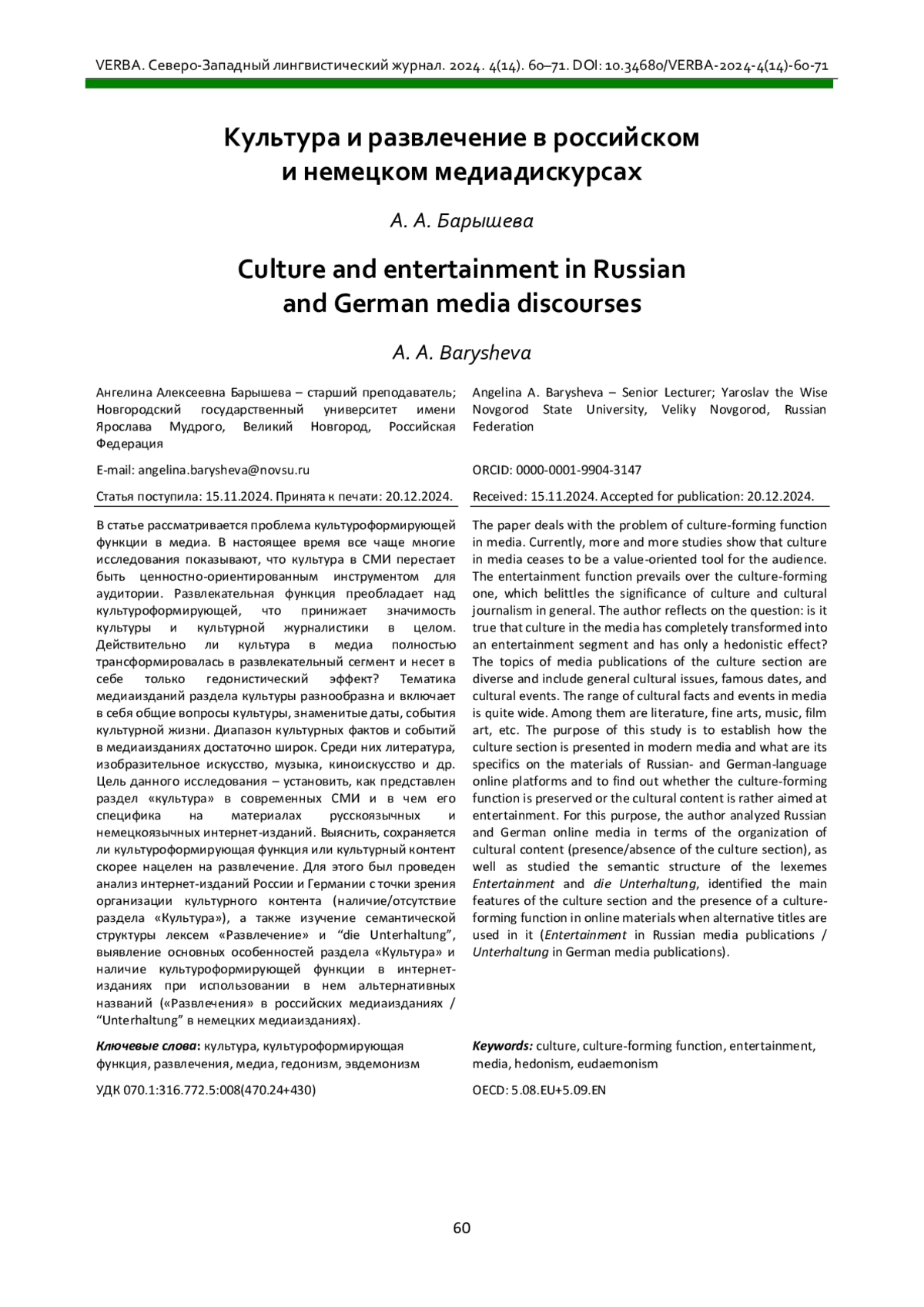 БАРЫШЕВА А. А. КУЛЬТУРА И РАЗВЛЕЧЕНИЕ В РОССИЙСКОМ И НЕМЕЦКОМ МЕДИАДИСКУРСАХ // VERBA. СЕВЕРО-ЗАПАДНЫЙ ЛИНГВИСТИЧЕСКИЙ ЖУРНАЛ. 2024. № 4 (14)