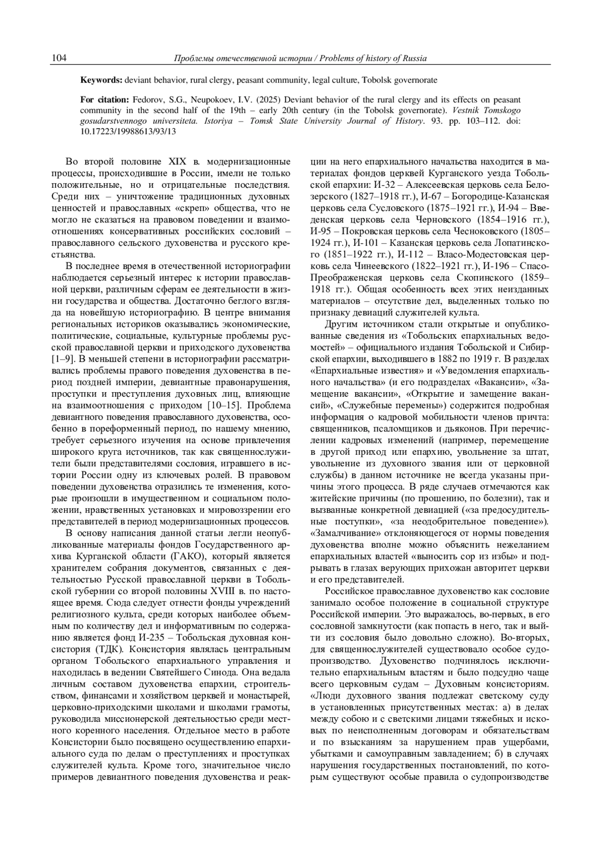 Рассматриваются различные виды девиантных правонарушений духовенства Тобольской губернии. Доказывается, что девиантное поведение сельского духовенства повлияло на развитие религиозного индифферентизма среди крестьянской общины. Причину этого авторы видят в процессах модернизации российского общества. Авторы заявляют об отсутствии конфликта интересов.