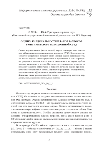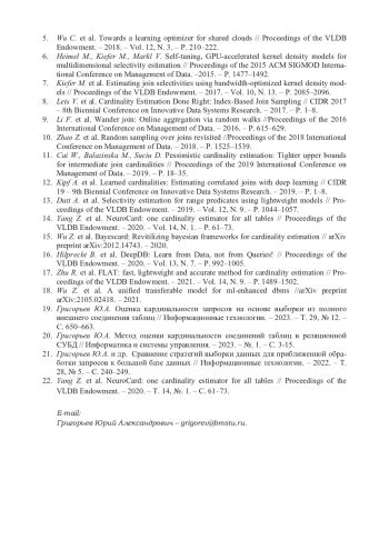 20. Григорьев Ю.А. Метод оценки кардинальности соединений таблиц в реляционной СУБД // Информатика и системы управления. - 2023. - №. 1. - С. 3-15. EDN: QLWNUM