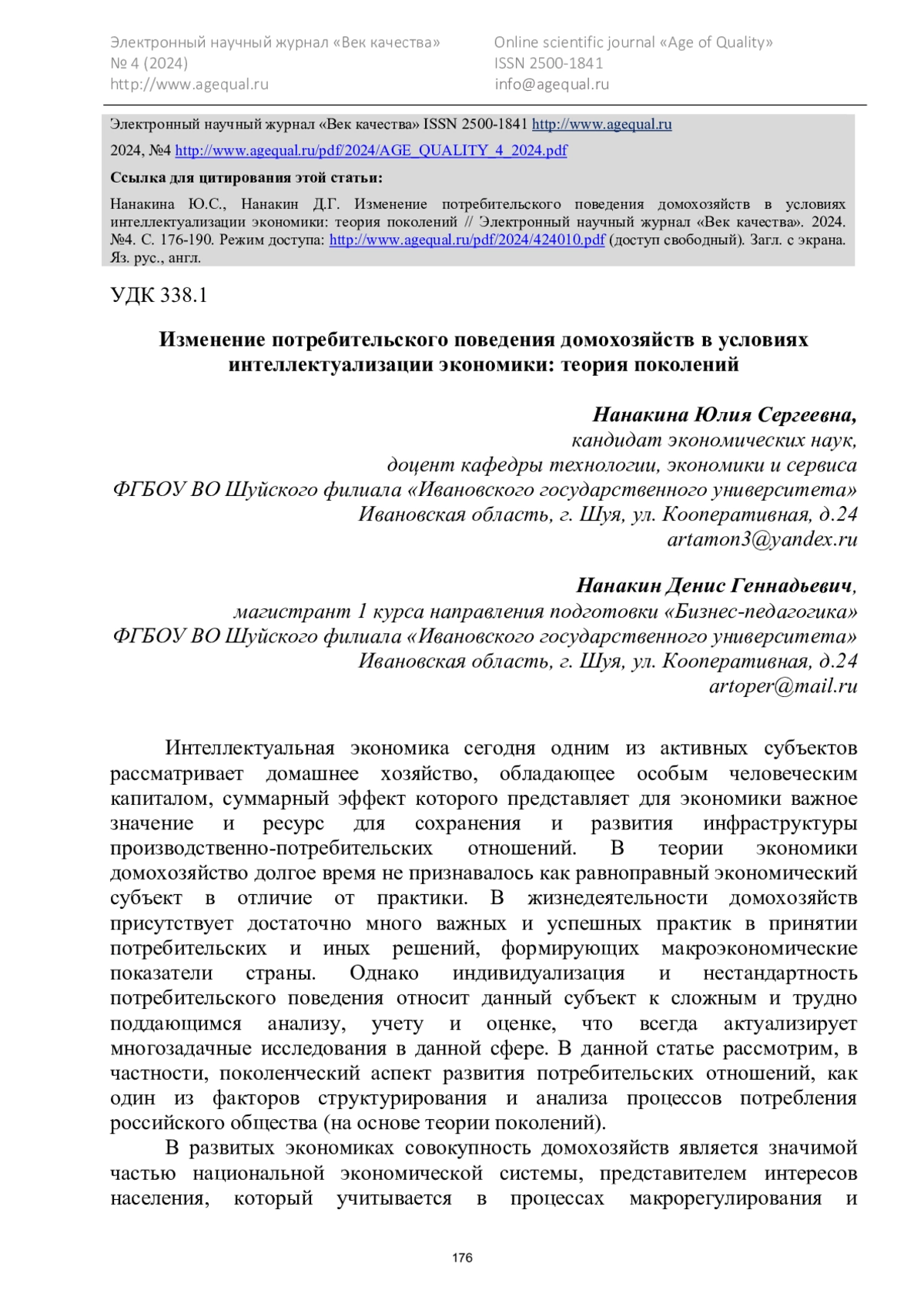 3. Нанакина Ю.С., Рябова О.Н. К проблеме рисков и неопределенности потребления: теоретический аспект// Век качества: электронный научный журнал. - 2023. - № 4. - С. 164-178. - Режим доступа: http://www.agequal.ru/pdf/2023/423011.pdf.