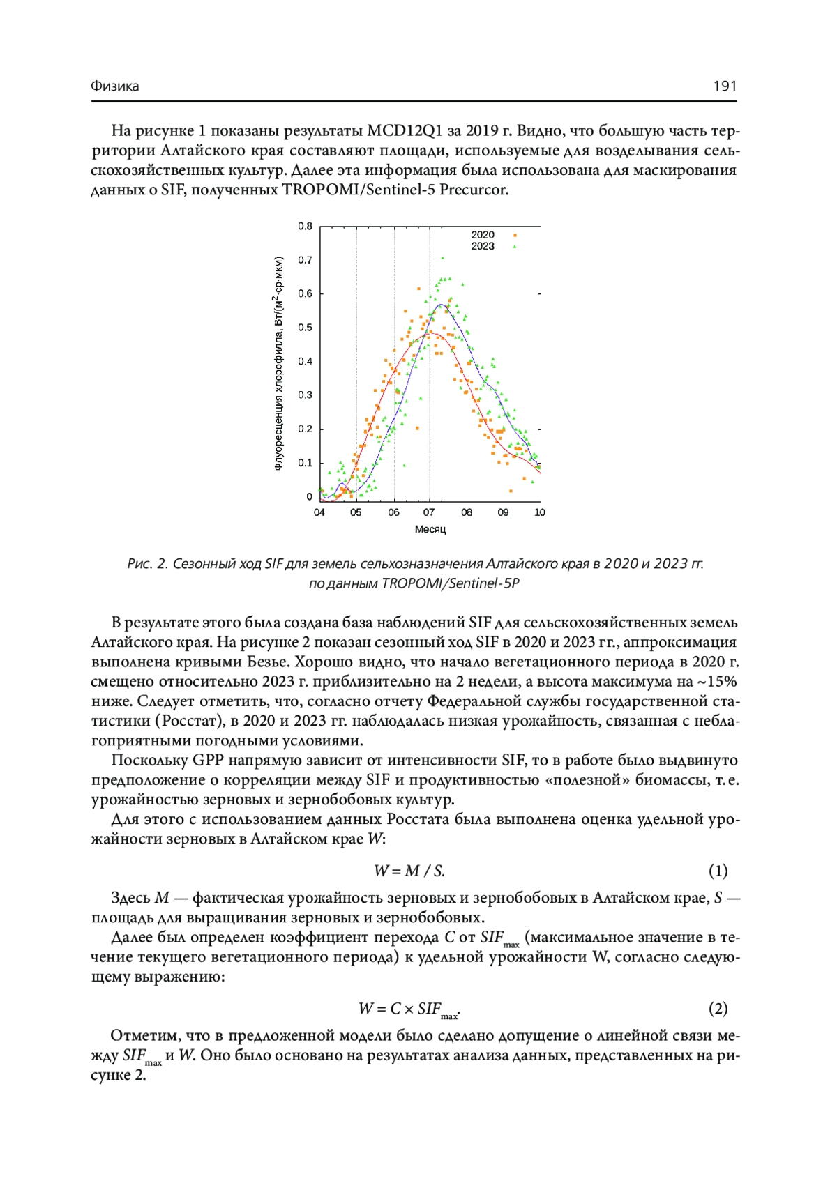 Поглощение фотона хлорофиллом переводит его в возбужденное состояние, при этом небольшая часть энергии возбуждения (0,5–2%) всегда возвращается в окружающую среду в виде флуоресцентного излучения. Его принято называть флуоресценцией хлорофилла, индуцированной солнечной энергией (SIF, от английского Solar-induced fluorescence) [6]. SIF испускается в диапазоне от 600 до 800 нм во время световой фазы реакции фотосинтеза, когда энергия, поглощенная пигментами листьев, преобразуется в химическую энергию, необходимую для темновой фазы реакци при переработке углекислого газа в сахара. Интенсивность SIF напрямую связана с интенсивностью фотосинтеза, что является перспективным инструментом для оценки GPP. Инструментальные наблюдения SIF могут служить индикатором воздействия изменений окружающей среды на развитие сельскохозяйственных культур.