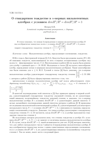 В качестве подтверждения этой гипотезы в [5] был приведен пример n-мерной алгебры, удовлетворяющей стандартному тождеству указанной степени, но не удовлетворяющей никакому полилинейному тождеству меньшей степени, и доказано, что n-мерная нильпотентная алгебра R с условием dimR2/R3 = 2 удовлетворяет данной гипотезе. С целью дальнейшего подтверждения данной гипотезы автором в работах [6–9] проведены исследования нильпотентной конечномерной алгебры R, удовлетворяющей для некоторого натурального числа N > 1 условию: dimRN /RN+1 = 2, с описанием ее строения, определяющих соотношений и тождеств. Доказано, что такая алгебра удовлетворяет стандартному тождеству степени N + 2. В частности, когда dimR2/R3 = 2, в алгебре выполняется стандартное тождество степени 4.