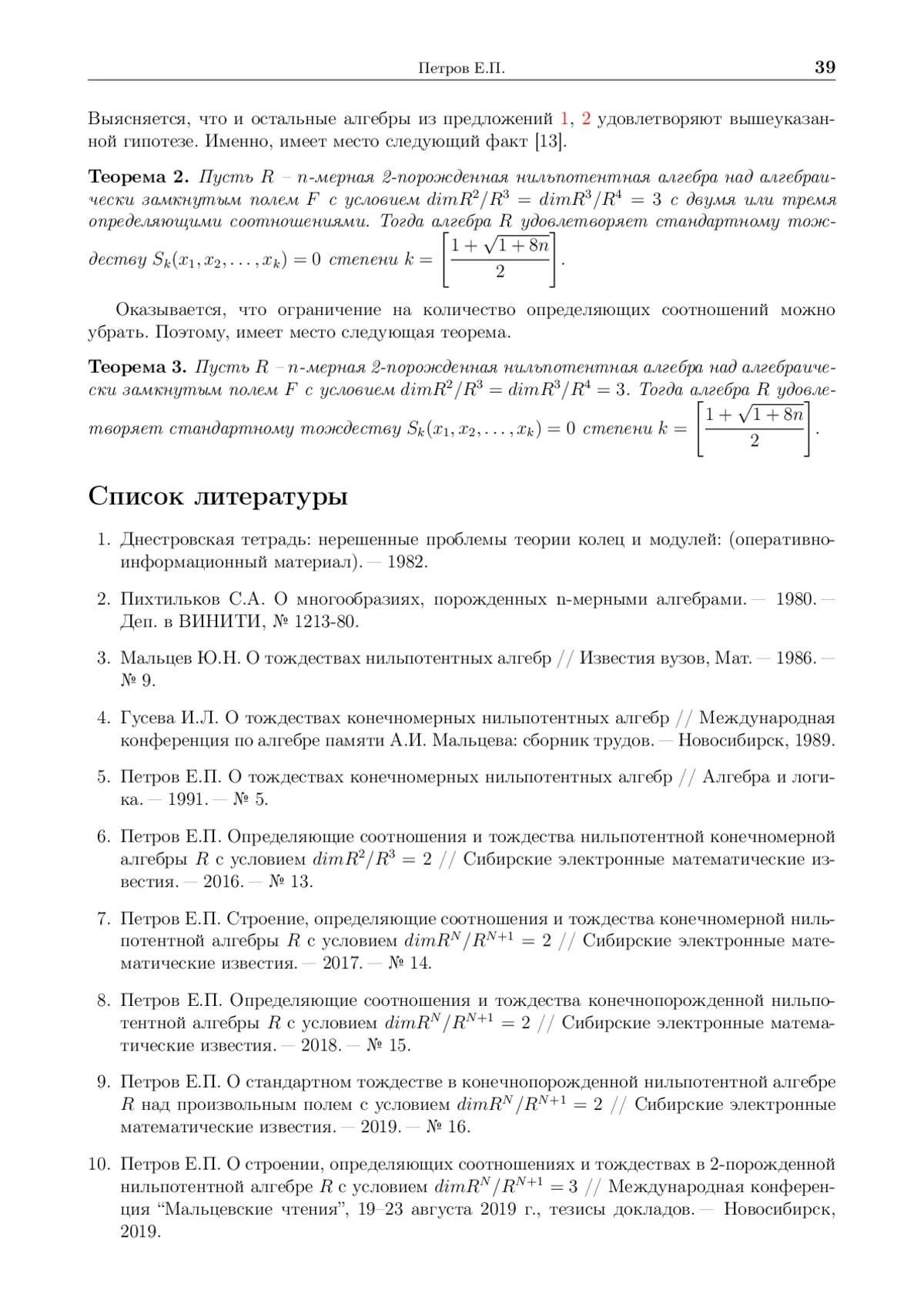 9. Петров Е.П. О стандартном тождестве в конечнопорожденной нильпотентной алгебре R над произвольным полем с условием dim R^N/R^{N+1}=2 // Сибирские электронные математические известия. - 2019. - №16. EDN: UIRLBQ 10. Петров Е.П. О строении, определяющих соотношениях и тождествах в 2-порожденной нильпотентной алгебре R с условием dim R^N/R^{N+1}=3 // Международная конференция “Мальцевские чтения”, 19-23 августа 2019 г., тезисы докладов. - Новосибирск, 2019.