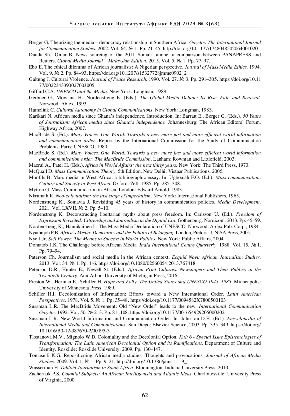 4 Беавоги Б. Средства массовой информации африканских стран: от несвободы к свободе и обратно («Закон маятника»). Проблемы современной науки и образования. 2012. № 14. C. 67‒73. 5 Грибанова В. В., Усачева В. В. Неоколониализм в сфере образования и СМИ в Африке: некоторые итоги перехода от культурного к цифровому империализму. Электронный научно-образовательный журнал «История». 2023. Том 14. № S23. С. 168‒182. https://doi. org/10.18254/S207987840025593-1