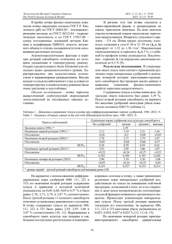 В зоне неустойчивого и неравномерного увлажнения многолетние наблюдения за применением минеральной системы удобрения полевых культур в 11-польном зернотравяно-пропашном севообороте на черноземе выщелоченном выявили изменения свойств почвы. Показатели суммы поглощенных оснований, степени насыщенности почвы основаниями снизились. Использование минеральных удобрений, которые в ходе питания растений проявляют физиологическую кислотность, способствуют изменению физико-химических свойств. Растительные (пожнивные и корневые) остатки, отсутствие органических удобрений при реализации севооборота содействуют дегумификации почвенного органического вещества, образованию наиболее мобильных фракций гумуса, имеющих более кислую реакцию.