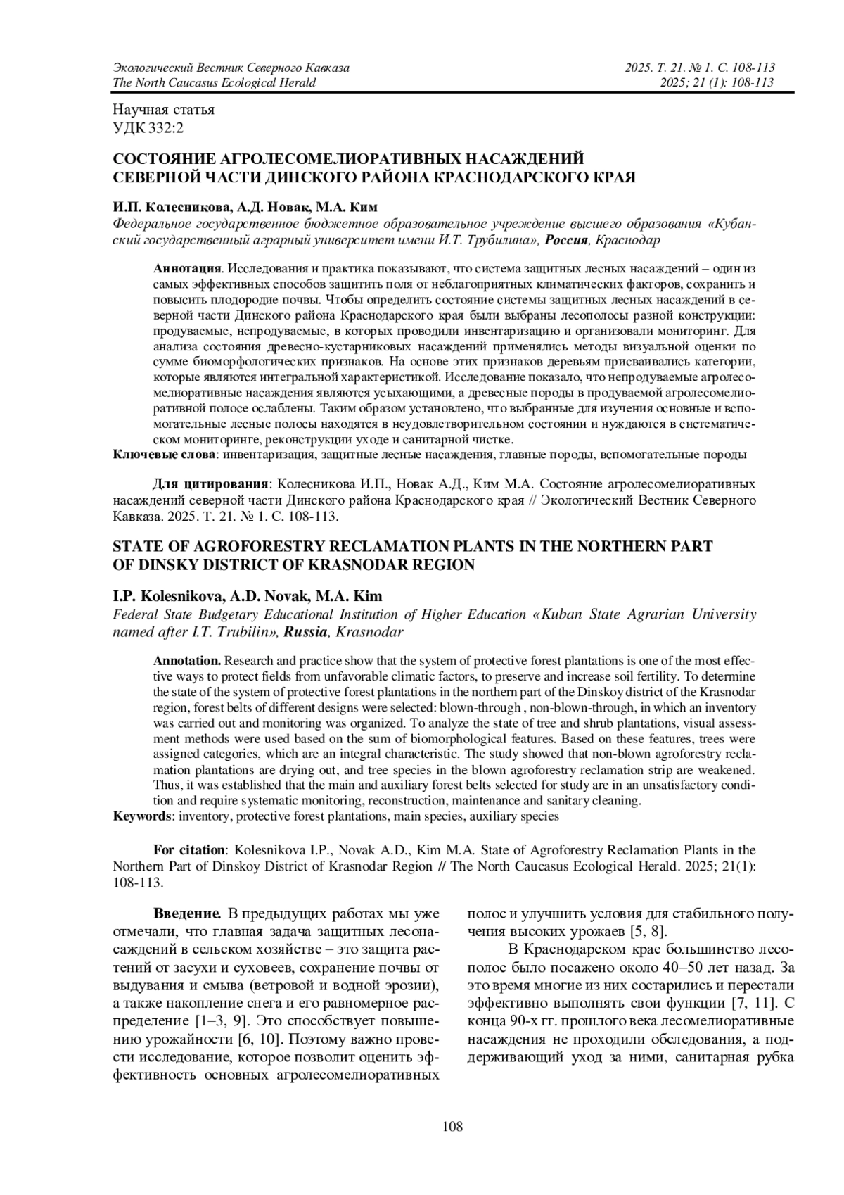 7. Оценка состояния древостоя ореха черного в защитных насаждениях учебно-опытного хозяйства “Кубань” Кубанского ГАУ / И.П. Колесникова, А.И. Мельченко, А.Ф. Инюкин [и др.] // Экологический Вестник Северного Кавказа. 2024. Т. 20. № 1. С. 188-194.