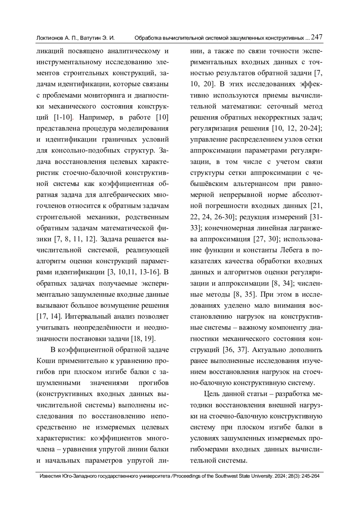 30. Локтионов А.П. Восстановление начальных параметров балки при заданных младших коэффициентах уравнения прогибов // Строительная механика и расчет сооружений. 2022; 6: 2-7. DOI: 10.37538/0039-2383.2022.6.2.7 EDN: MOFHIG