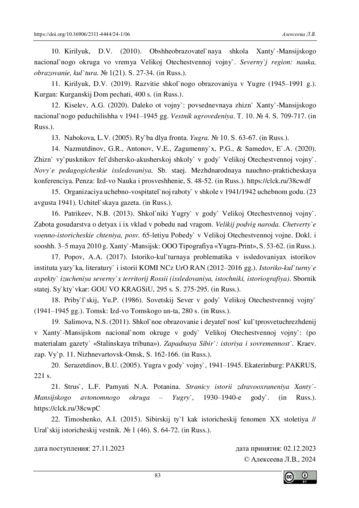 10. Кирилюк Д.В. Общеобразовательная школа Ханты-Мансийского национального округа во время Великой Отечественной войны // Северный регион: наука, образование, культура. 2010. № 1(21). С. 27-34. EDN: VSQNWJ