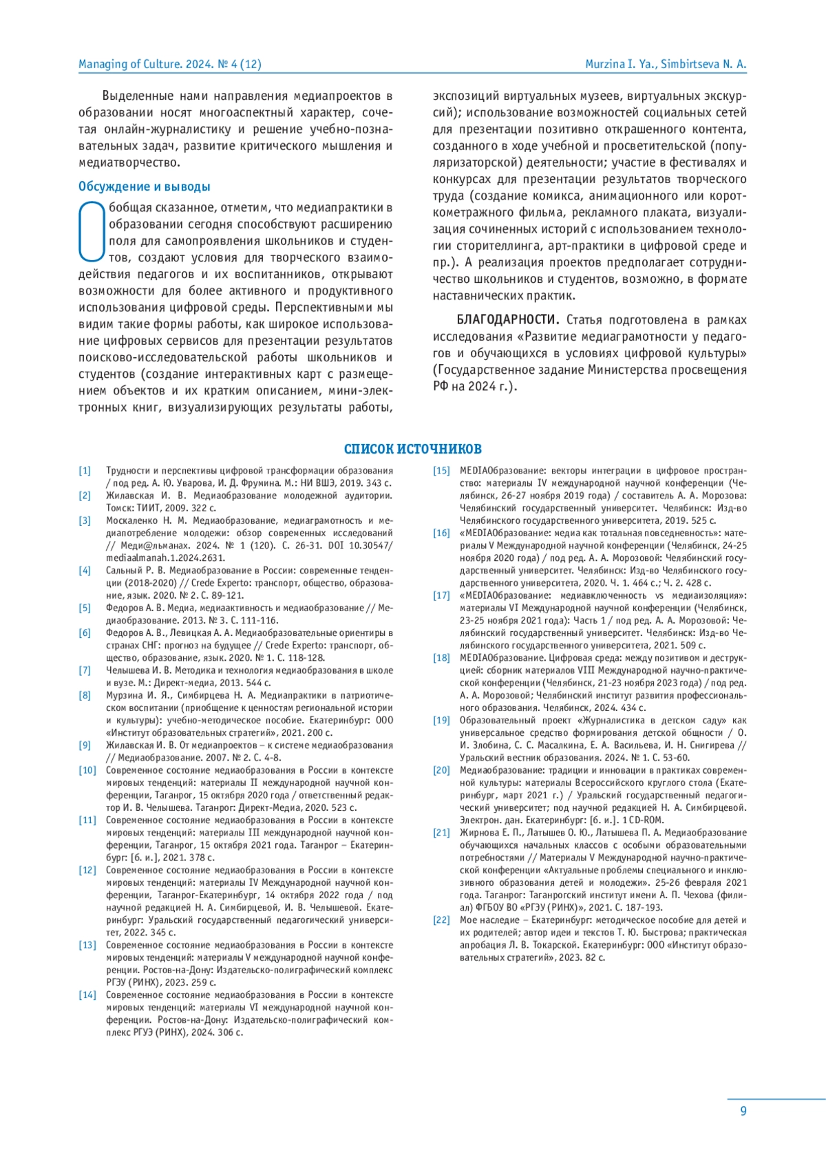 [8] Мурзина И. Я., Симбирцева Н. А. Медиапрактики в патриотическом воспитании (приобщение к ценностям региональной истории и культуры): учебно-методическое пособие. Екатеринбург: OOO «Институт образовательных стратегий», 2021. 200 с.