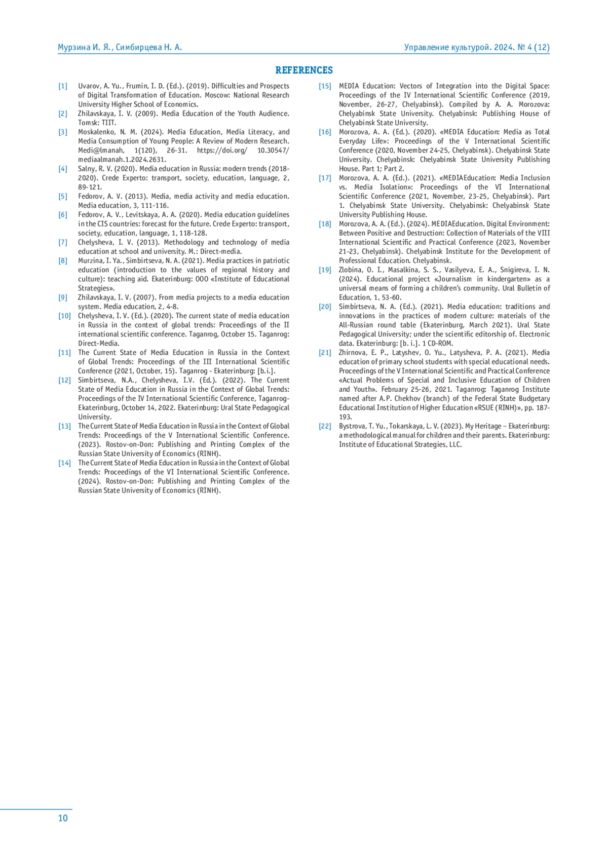 [3] Москаленко Н. М. Медиаобразование, медиаграмотность и медиапотребление молодежи: обзор современных исследований // Меди@льманах. 2024. № 1 (120). С. 26-31. DOI 10.30547/ mediaalmanah.1.2024.2631.