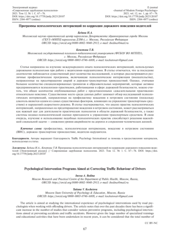 Статья направлена на изучение международного опыта психологических интервенций, используемых дорожными психологами при работе с водителями-нарушителями. В статье отмечается, что за последние десятилетия наблюдается существенный рост количества исследований, в которых рассматриваются различные профилактические программы, включающие психологические интервенции (вмешательства), направленные на предотвращение аварий и дорожно-транспортных происшествий. Однако, учитывая большое количество специализированных тренингов и образовательных мероприятий, которые активно предпринимаются психологами-практиками, работающими в сфере дорожной безопасности, можно считать, что общее количество опубликованных работ с представленными «доказательными практиками» относительно невелико. Существенное место среди данных работ занимает обзор исследований психологических интервенций, направленных на профилактику вождения в нетрезвом состоянии (поскольку алкоголь является одним из самых существенных факторов, влияющих на управление транспортным средством) и нарушений скоростного режима. В статье подчеркивается, что анализ практик психологических интервенций, направленных на предотвращение вождения в нетрезвом состоянии, может рассматриваться как важный шаг для деятельности практических психологов в области дорожной безопасности, а также системы медико-психологической оценки пригодности к управлению транспортным средством. В свою очередь, изучение и использование подобных психологических практик способствует решению важнейшей социальной задачи - снижения уровня аварийности на дорогах и сохранения человеческих жизней.